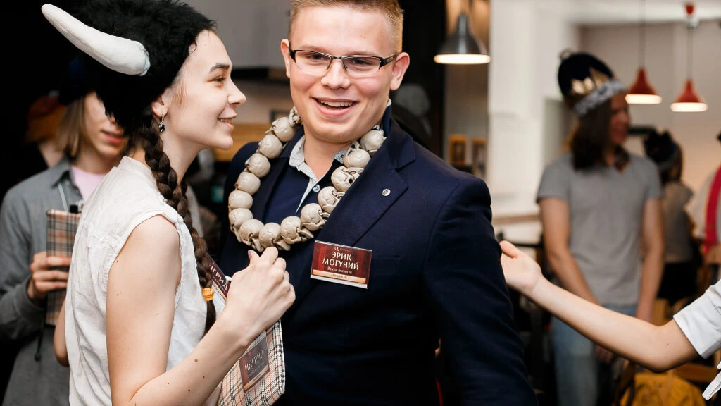Игра начинается с преображения. Ведущий раздаёт тематический реквизит и элементы костюмов. Короны и мантии, венцы, викингские топоры, загадочные амулеты — все это мы припасли для игроков «Ночи в Музее».